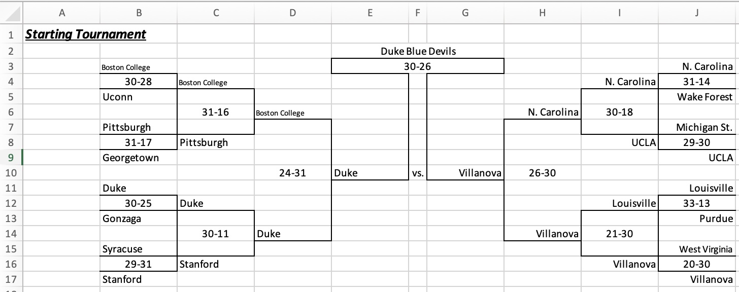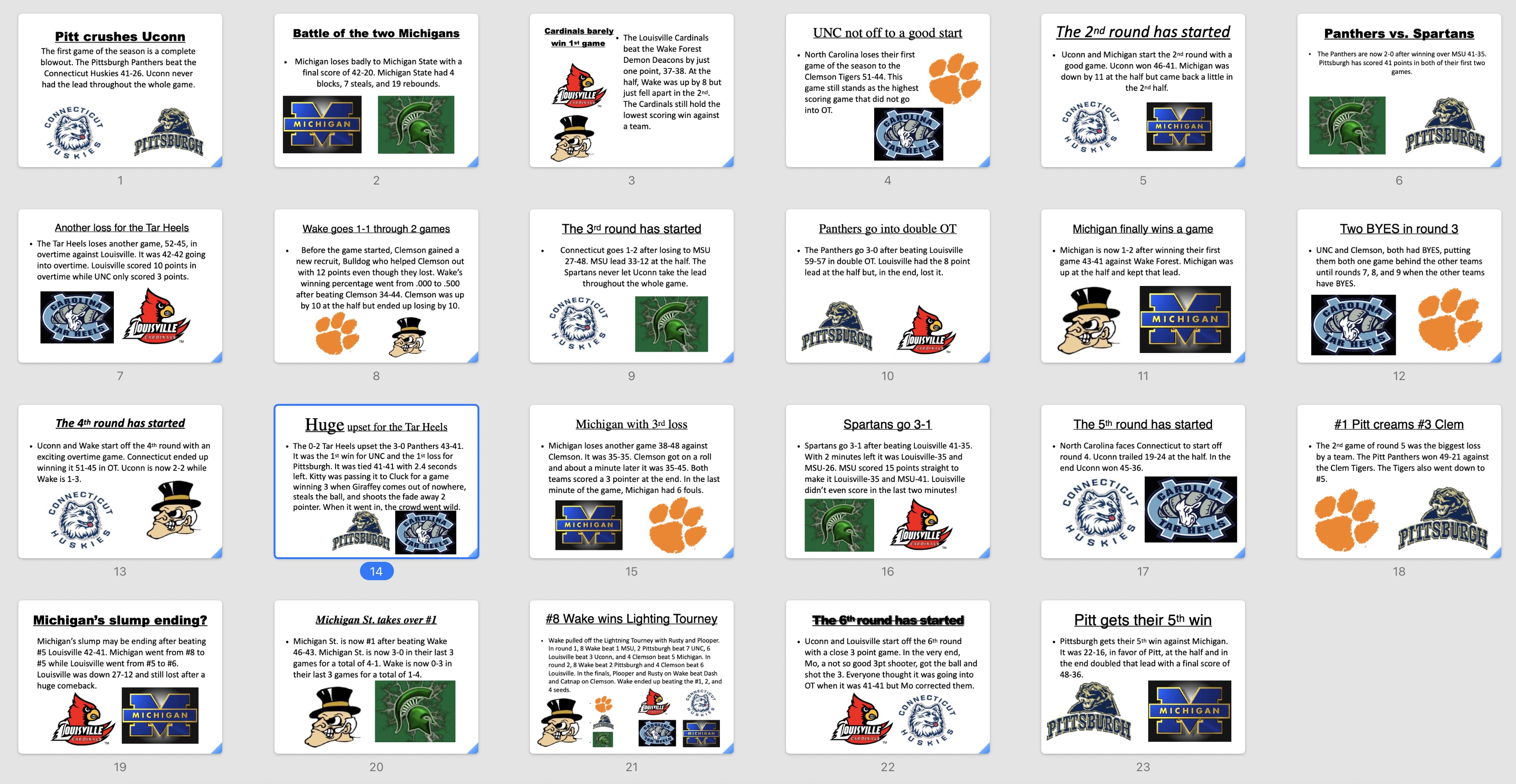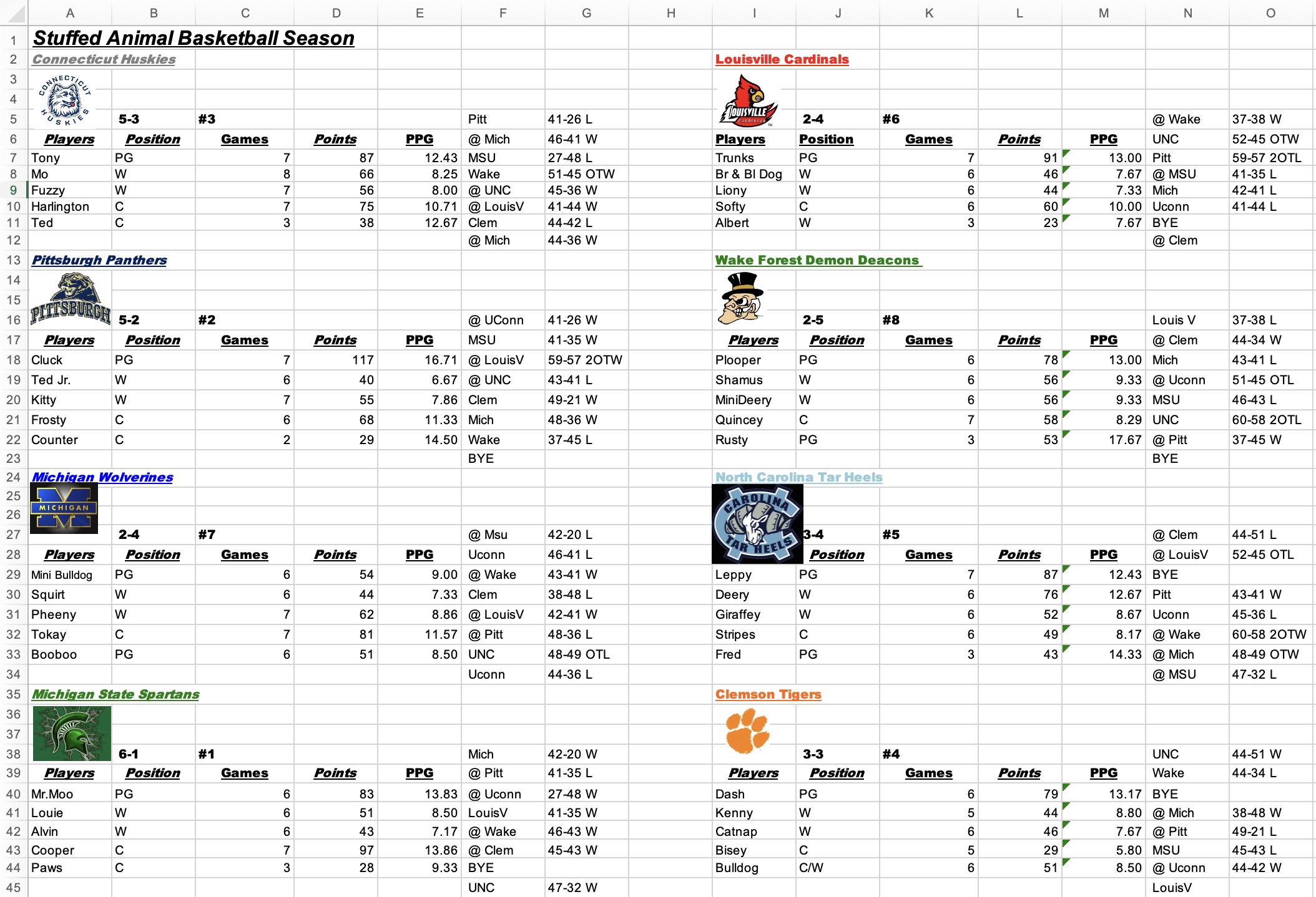 With our collection of 100+ stuffed animals, we drafted them into custom teams and played out the matches against each other on our miniature indoor basketball hoops; we created elaborate Excel spreadsheets to track the rosters, schedules, and stats (team and individual); we created PowerPoint presentations with news headlines of results and brackets; and we even drew up playbooks with made-up plays like "Green", "Sardine", "Squatch", and "Charmin".