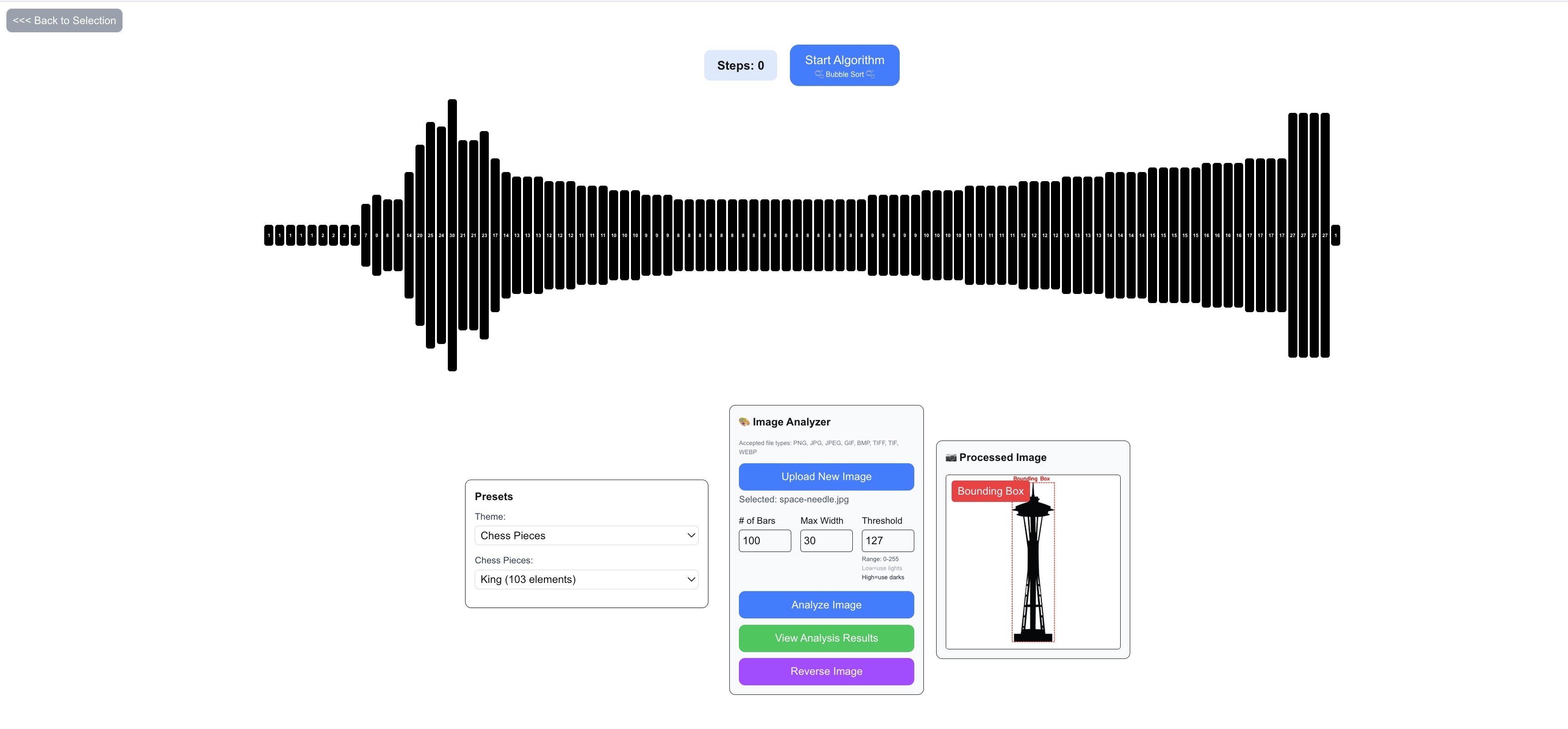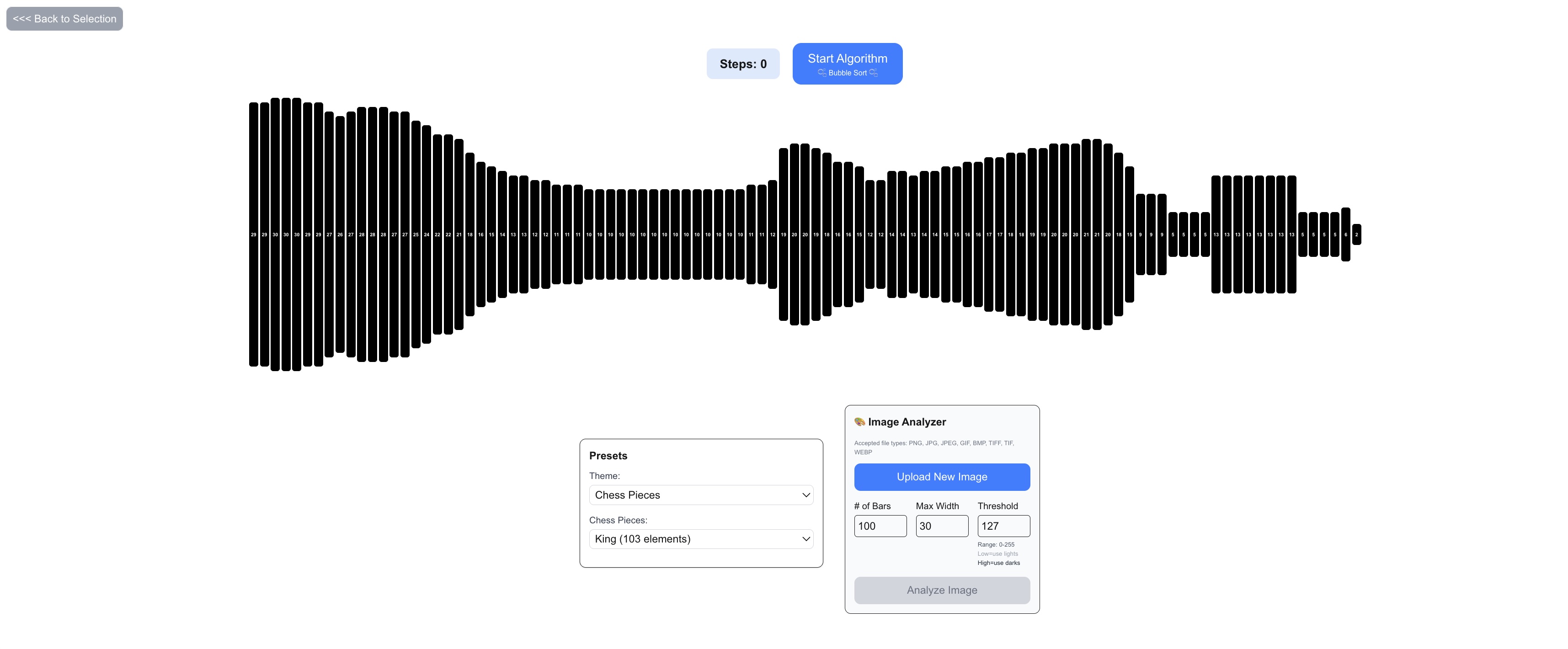 A visual demonstration tool for sort algorithms, with image analysis capabilities Open in New Tab Screenshots Links GitHub Repository